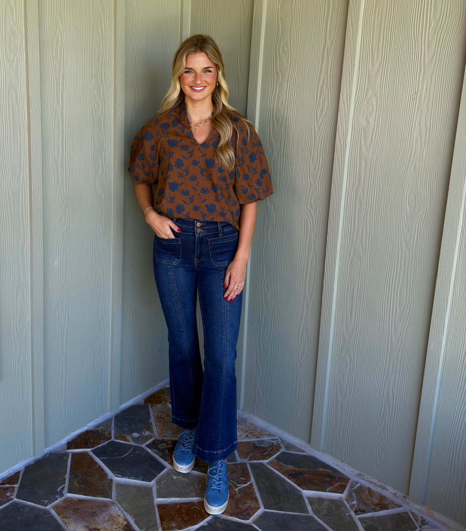 This stylish brown top with a blue floral print features elegant puff sleeves and a flattering V-neck, creating a chic silhouette. The design adds a touch of sophistication and femininity, making it perfect for both casual outings and classy occasions. Elevate your wardrobe with this versatile piece that combines comfort and timeless style.