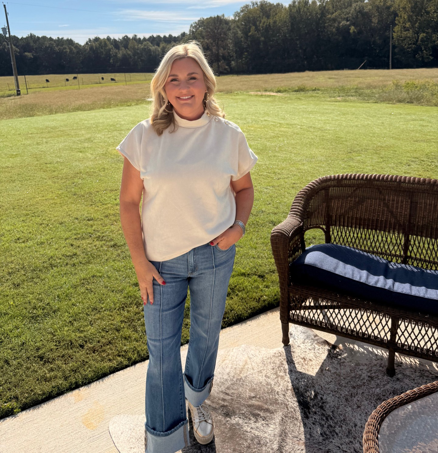 Elevate your everyday style with the THML short sleeve suede top, featuring a sophisticated mandarin collar. Available in olive and cream, it features chic button details on the left shoulder for a sharp, classy touch. This versatile piece effortlessly blends casual comfort with a classy finish. Dress it up for a polished look or keep it relaxed—either way, you’ll feel confident and chic all day long.