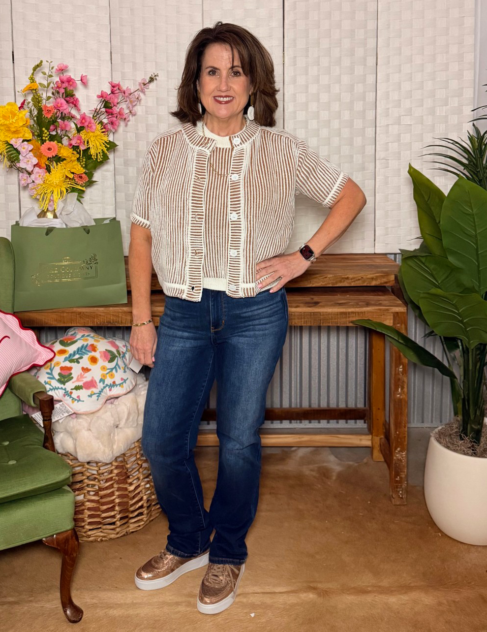 Light, airy, and quietly chic, this sheer striped cardigan is the definition of effortless layering. Designed with a classic button-front silhouette and soft neutral tones, it adds just the right amount of texture without overwhelming your look. The short sleeves and breathable weave make it perfect for warmer days when you still want a pulled-together finish.
