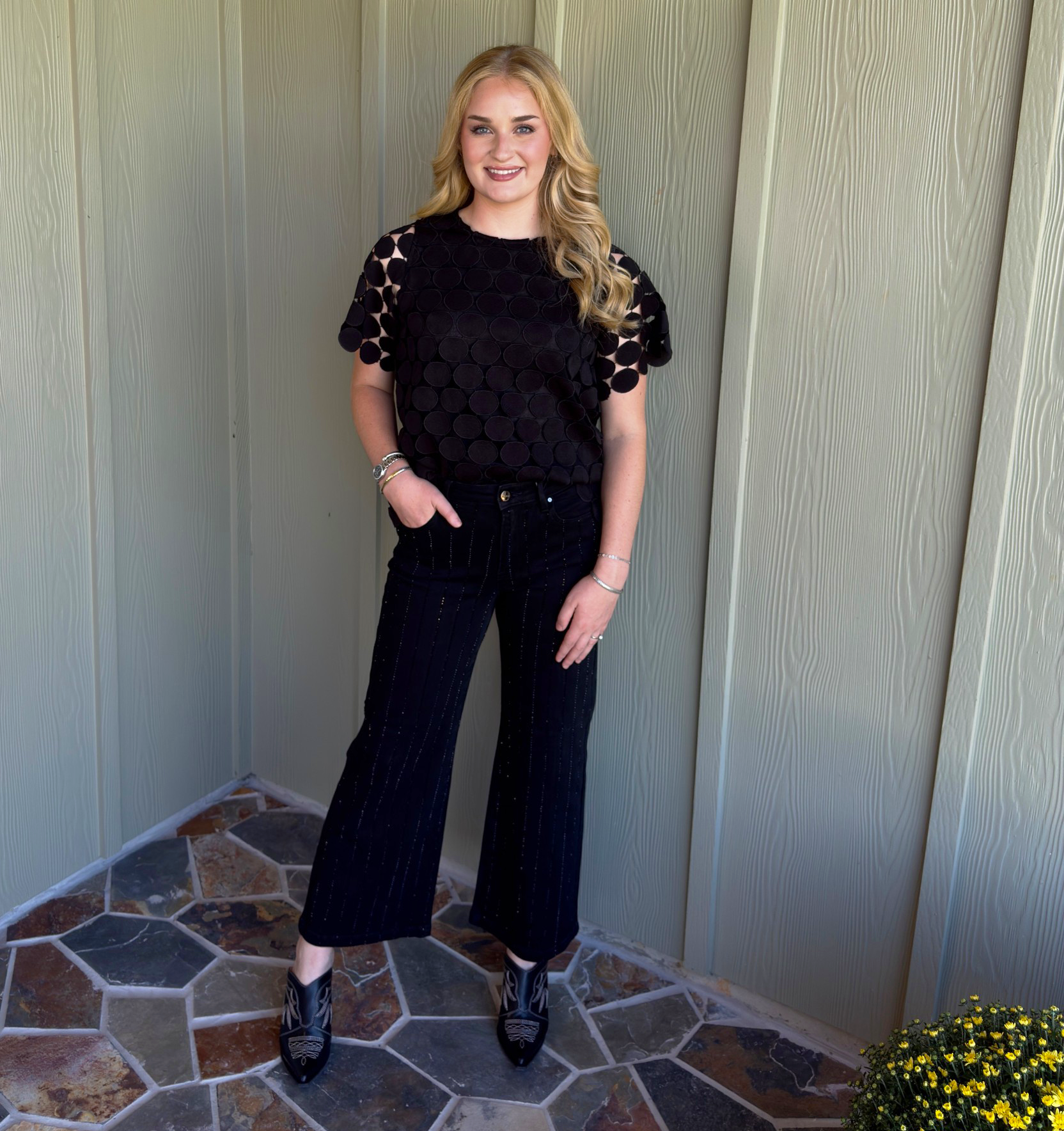 This Umgee Black Circle Top features a flattering round neck and short sleeves for everyday comfort. Its unique design showcases stitched circle details that add subtle texture and style. Perfect for pairing with your favorite jeans or skirts, this top effortlessly elevates your casual wardrobe with a chic, modern touch.