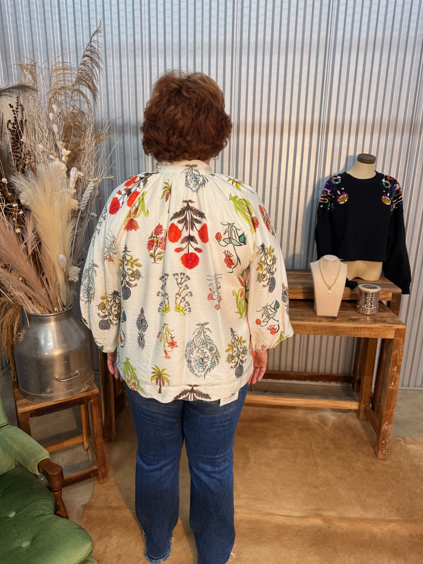 Bright, bold, and beautifully boho—this floral Umgee blouse is the perfect statement piece for anyone who loves color and effortless style. The textured crinkle fabric gives it a relaxed, lived-in feel while still looking polished. A split neckline adds a flattering touch, and the billowy sleeves bring extra charm and ease. Featuring a vibrant mix of botanical prints—palm leaves, blooms, vines, and tropical-inspired elements—this top pops with personality from every angle.