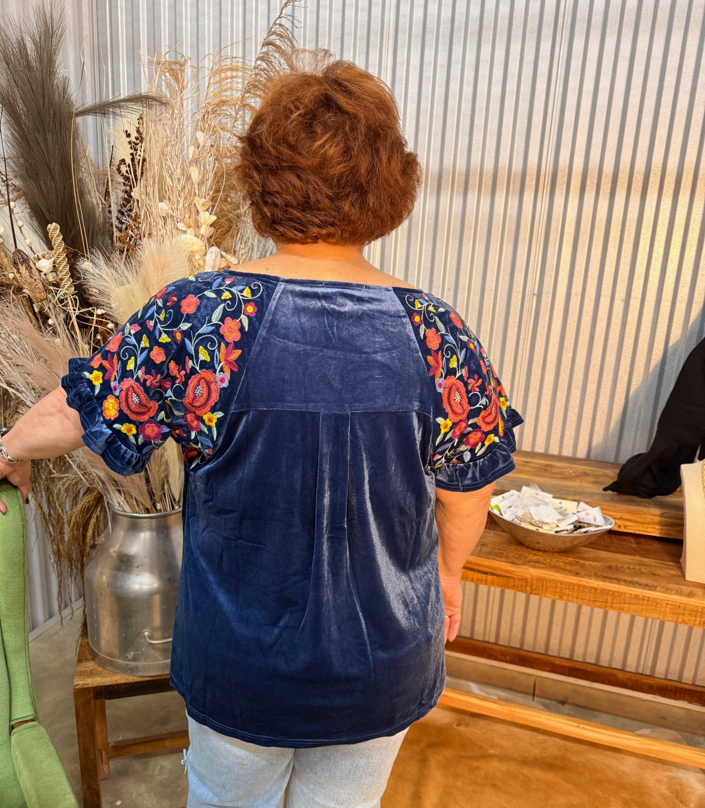 Soft, stunning, and just the right amount of statement — this Umgee velvet top is everything we love about fall style. The rich navy velvet drapes beautifully, while the vibrant embroidered sleeves add a bold, boho touch that makes this piece truly unforgettable.