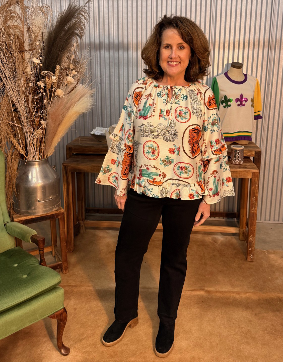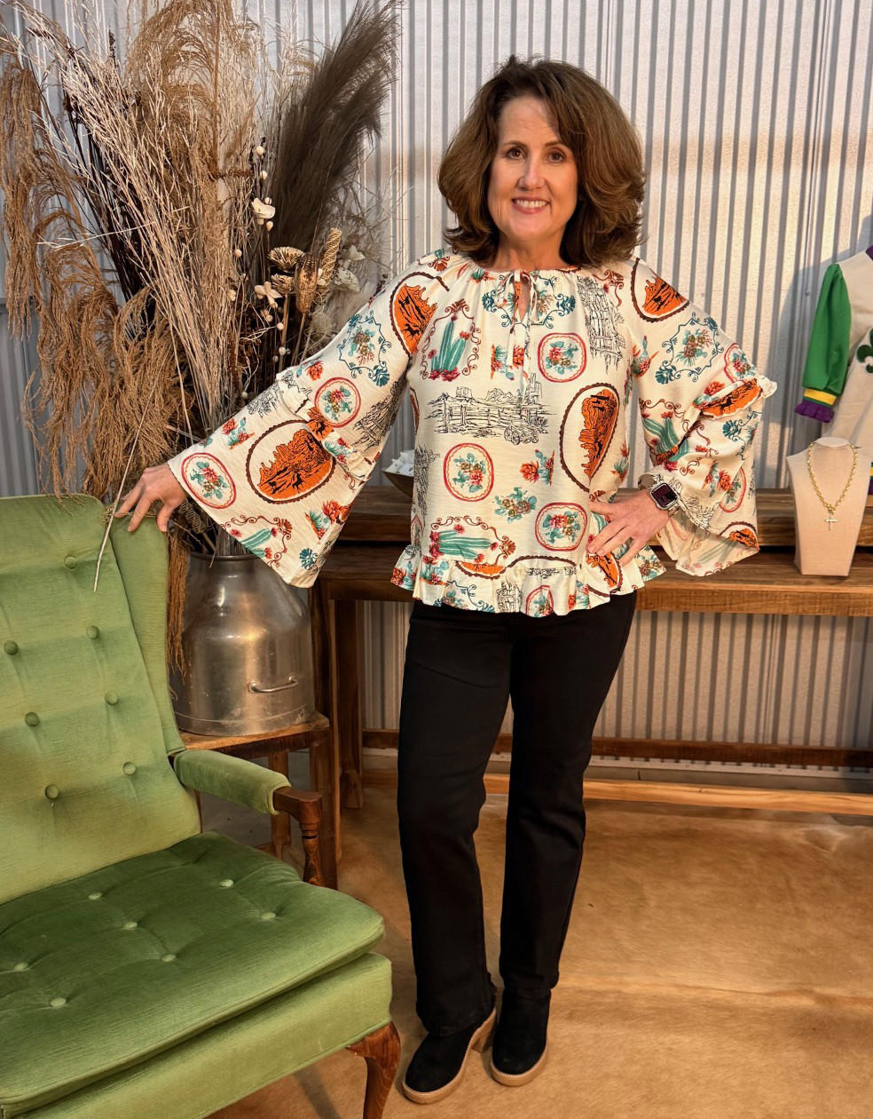 Bring all the Southwestern charm with this Western Desert Scene Peasant Blouse, featuring a mix of cacti, desert landscapes, and vintage Western-inspired artwork. Made from a lightweight, textured fabric, this top offers a relaxed peasant silhouette with a tie neckline and flowy sleeves that give it the perfect boho-cowgirl vibe. If you're searching for a Western blouse, cowgirl top, rodeo outfit top, or Southwestern print shirt, this one is a standout piece for any season.