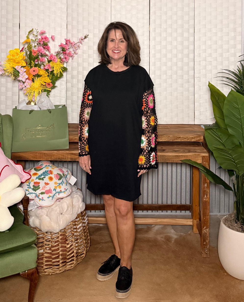 This playful knit dress is all about comfort with a pop of personality. The soft teal body keeps things simple and flattering, while the sleeves bring the wow factor — featuring colorful, handmade-style crochet panels that make every outfit feel unique and boutique-special. Easy, breezy, and so cute for everyday wear.