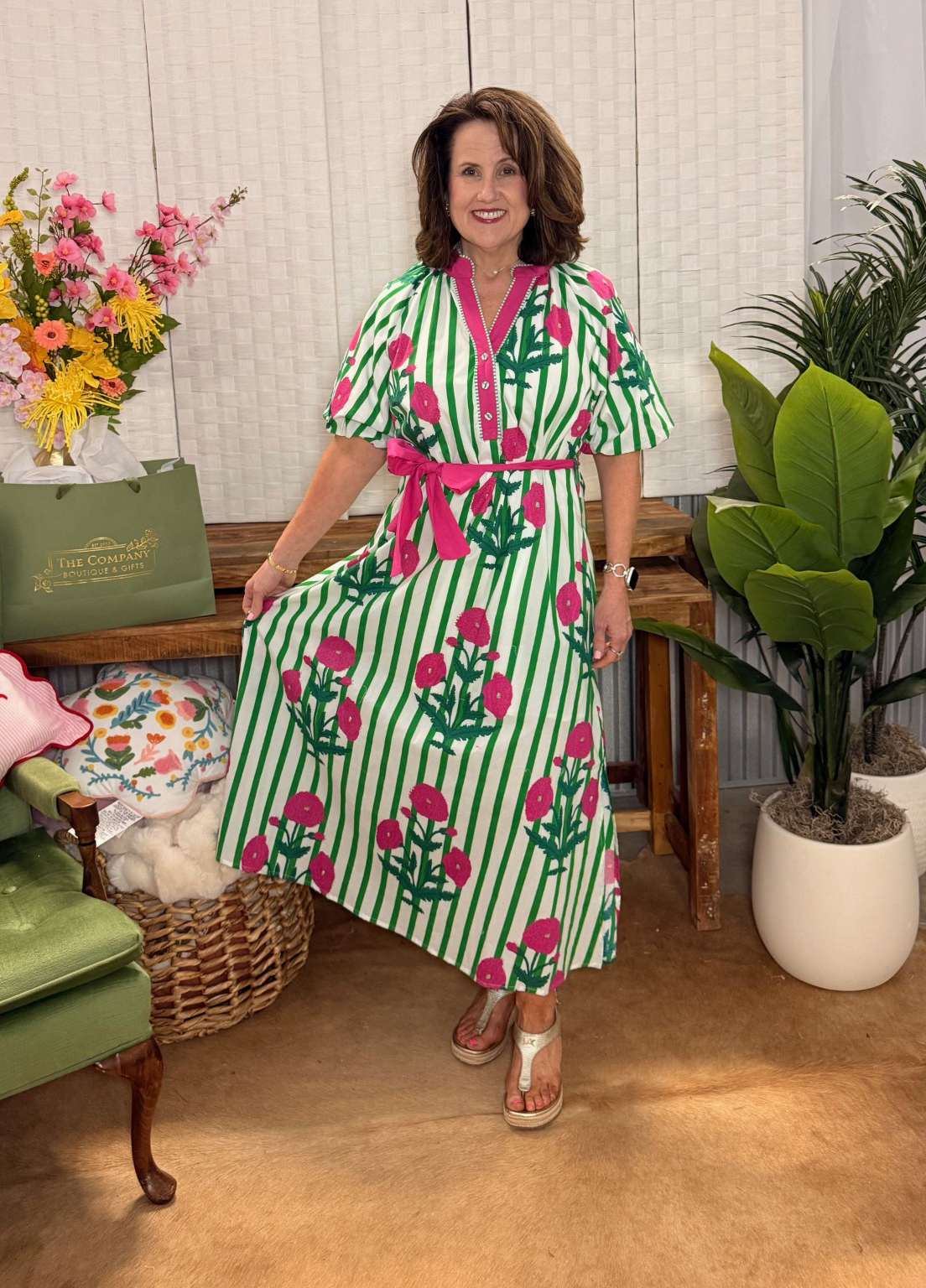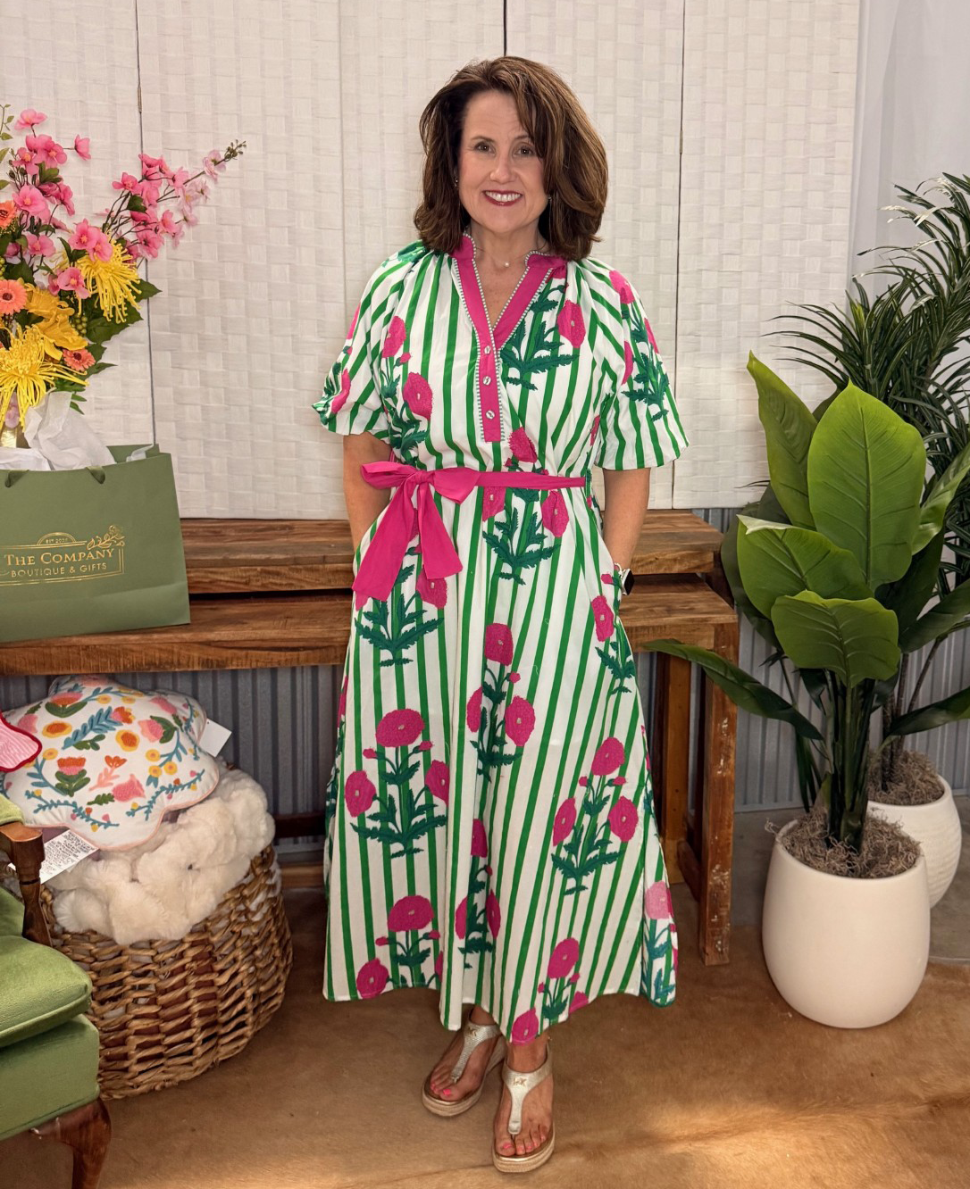 Bold, joyful, and full of personality, this green stripe and pink floral midi dress is a true statement piece. The vibrant mix of crisp stripes and playful florals feels fresh and fun, while the belted waist and easy silhouette keep it flattering and wearable.