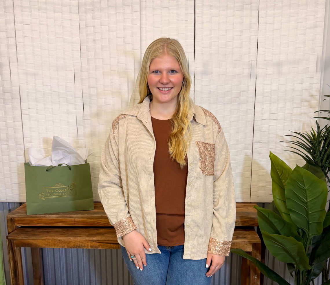 Add a little sparkle to your everyday with this glam-meets-casual corduroy shacket from Umgee. The soft champagne corduroy fabric pairs perfectly with rose-gold sequin accents on the shoulders, cuffs, and pocket for a look that’s cozy and eye-catching.