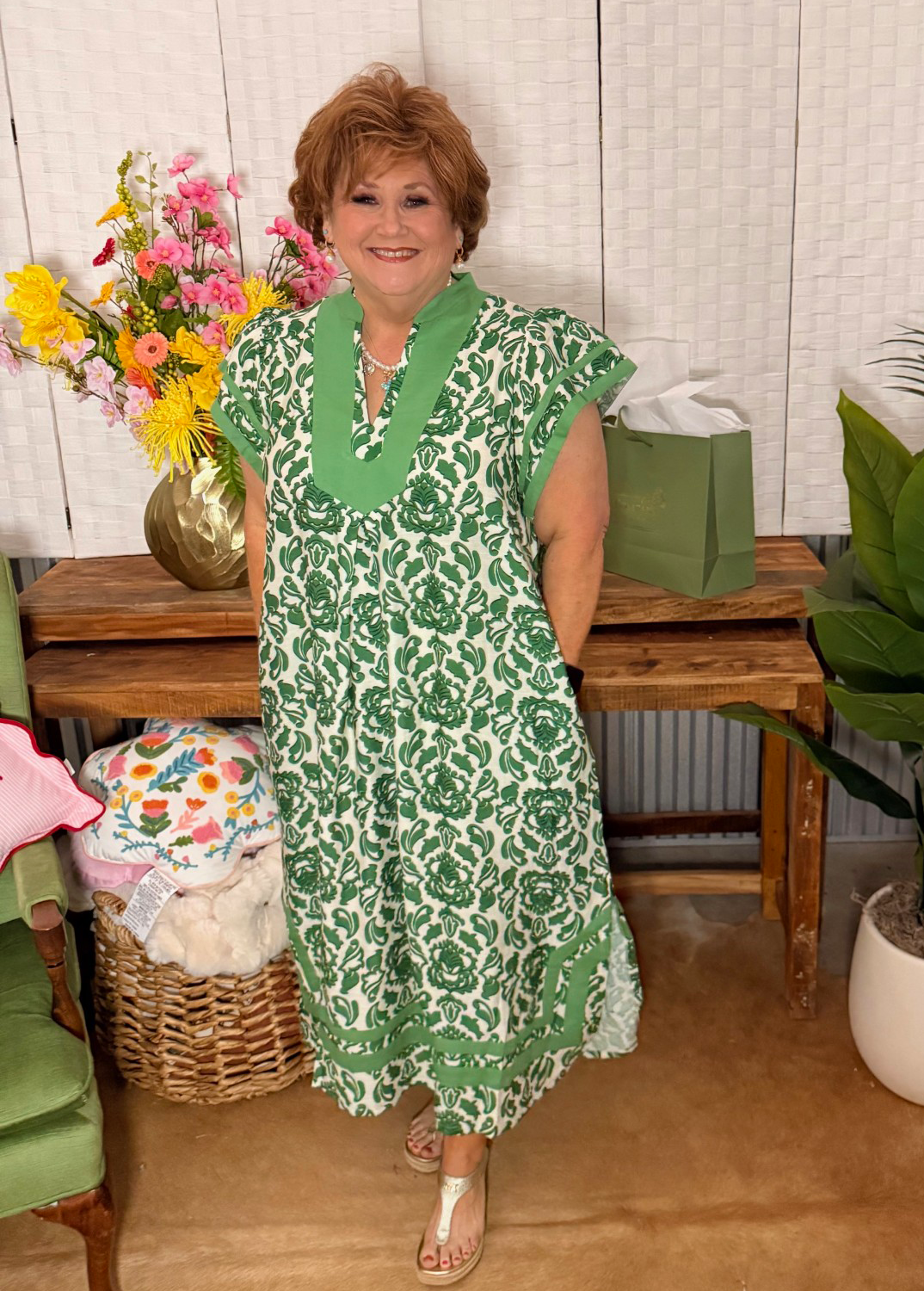 Fresh, breezy, and effortlessly chic — this green floral midi dress is your new go-to for warm days and easy outings. The bold green floral print stands out beautifully against the light background, while the solid green neckline adds a polished, elevated touch. With its relaxed silhouette and lightweight feel, this dress moves with you and keeps you comfortable all day long.
