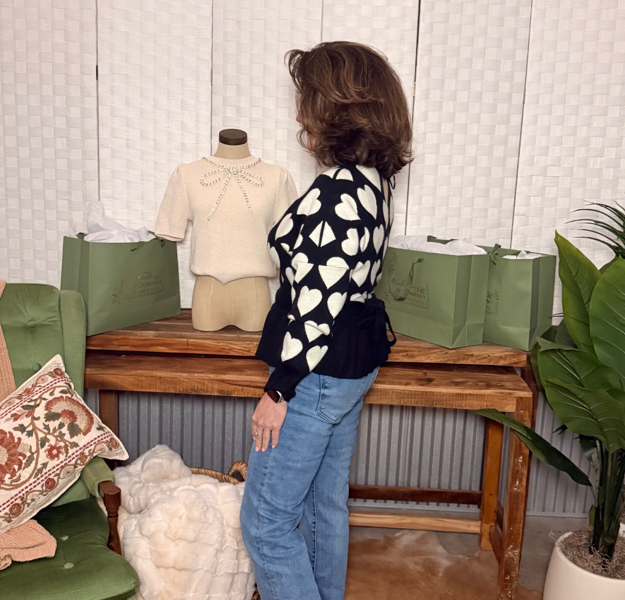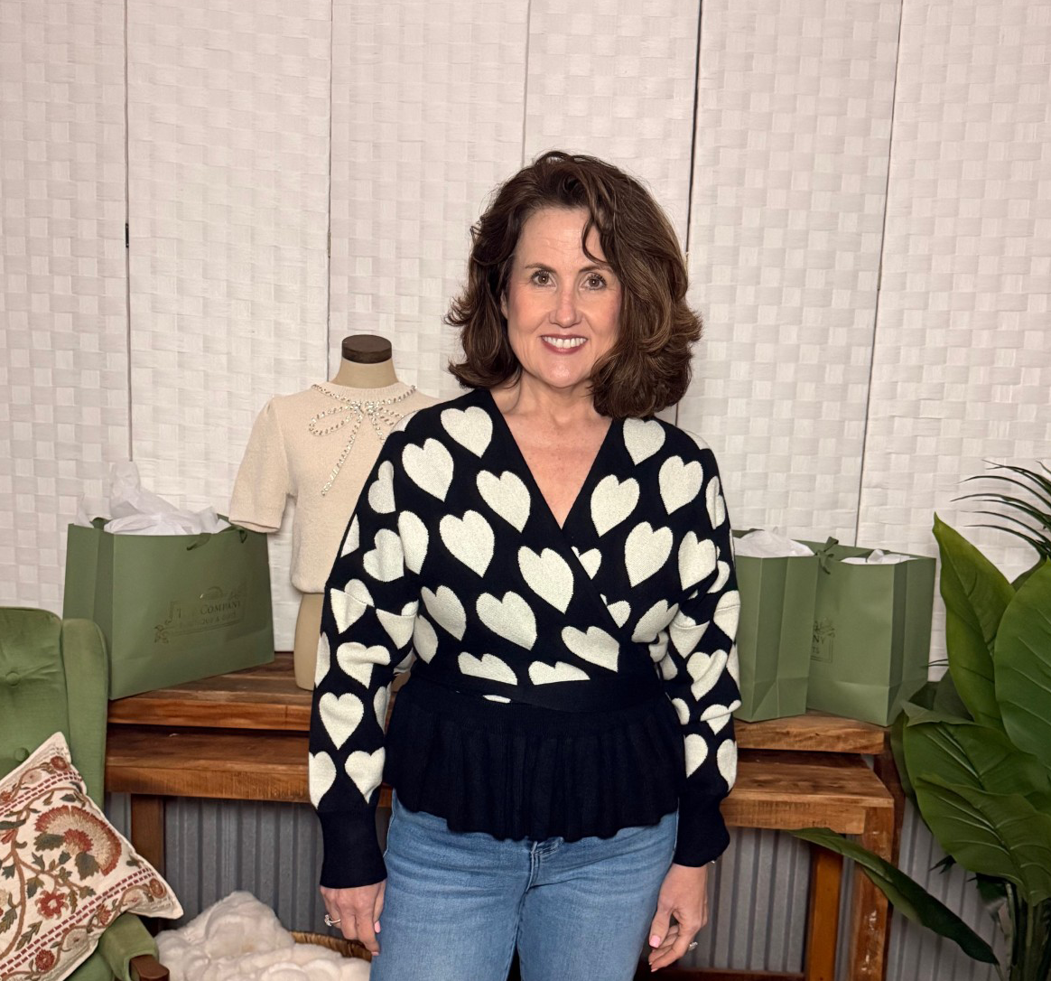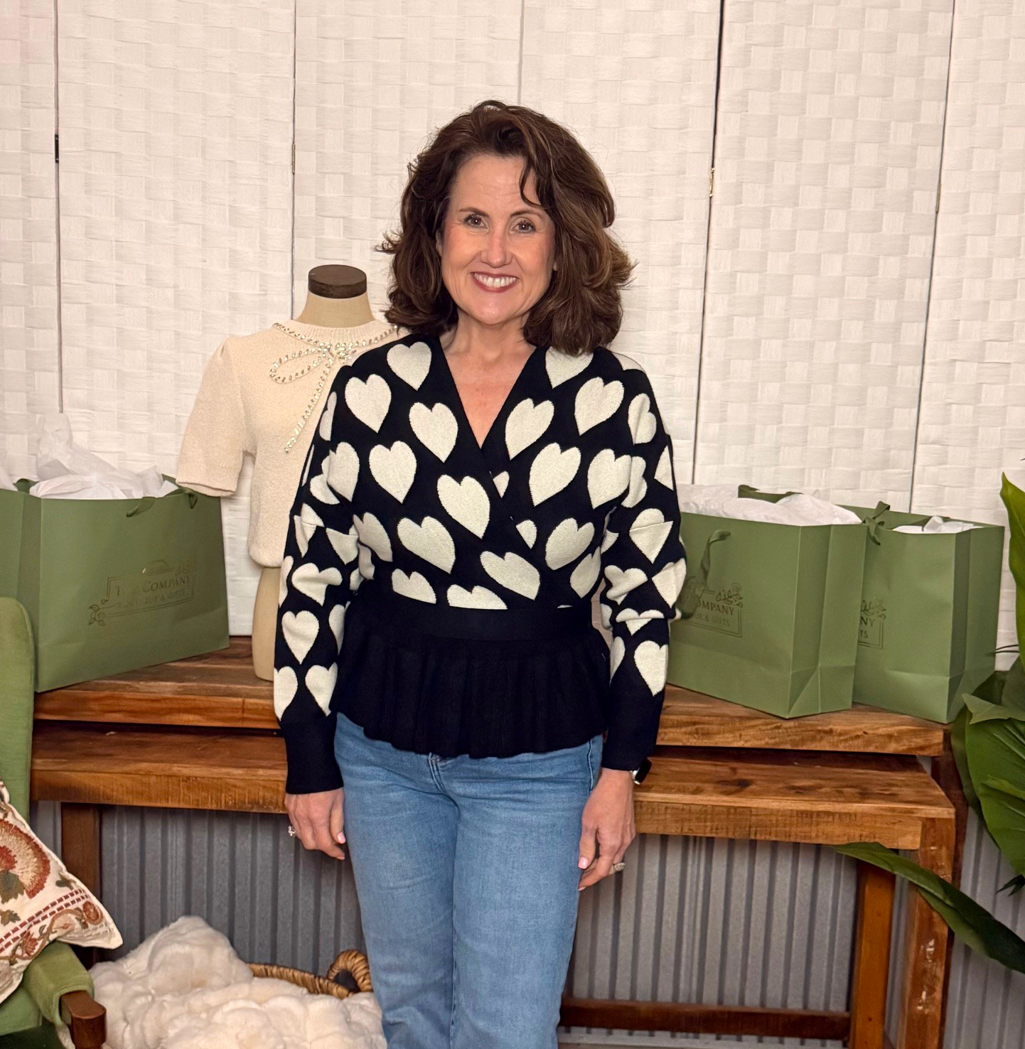 Fall in love with this adorable heart-print wrap sweater! The black knit with bold cream hearts gives it a playful yet chic vibe, while the wrap front and peplum hem create the most flattering silhouette. Cozy, stylish, and guaranteed to bring compliments everywhere you go.