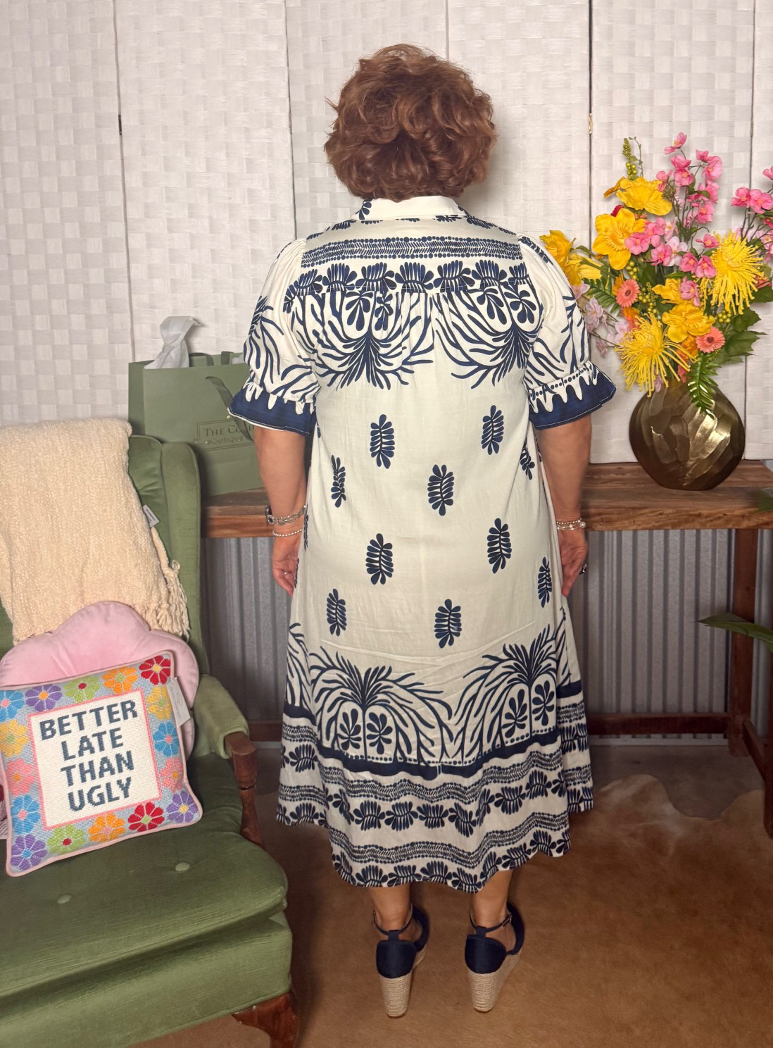 This one is effortlessly polished with just the right amount of personality 🤍 This gorgeous dress features a striking navy print on a soft cream backdrop, giving it a timeless feel with a fresh twist. The collared neckline and button-front detail bring a tailored touch, while the relaxed silhouette keeps it easy, comfortable, and flattering all day long.