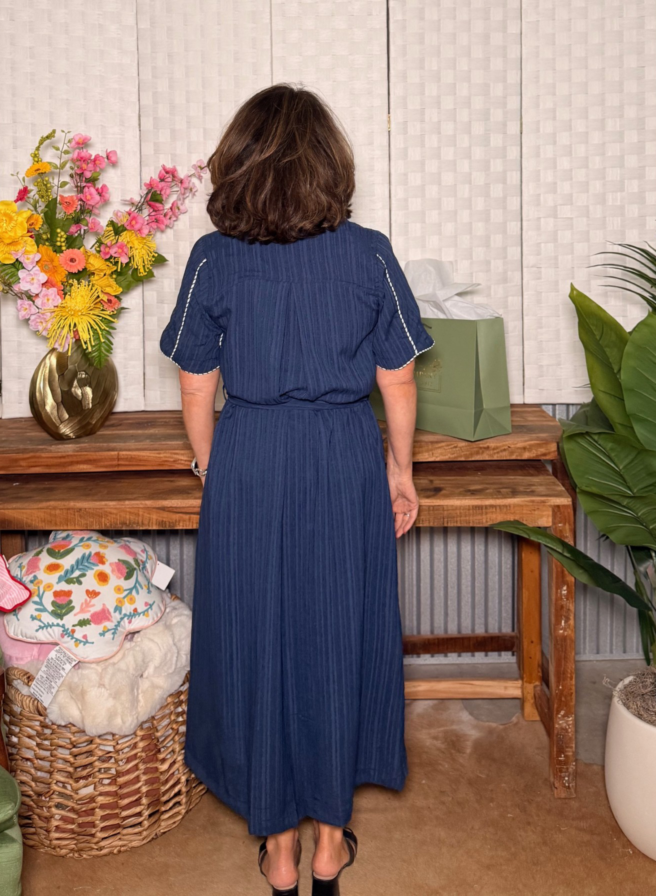 The contrast whipstitch-style trim along the collar, placket, and sleeves adds a subtle, eye-catching detail that sets this dress apart. The soft collar and short sleeves keep the look structured yet relaxed, making it perfect for workdays, church, lunch dates, and everything in between.
