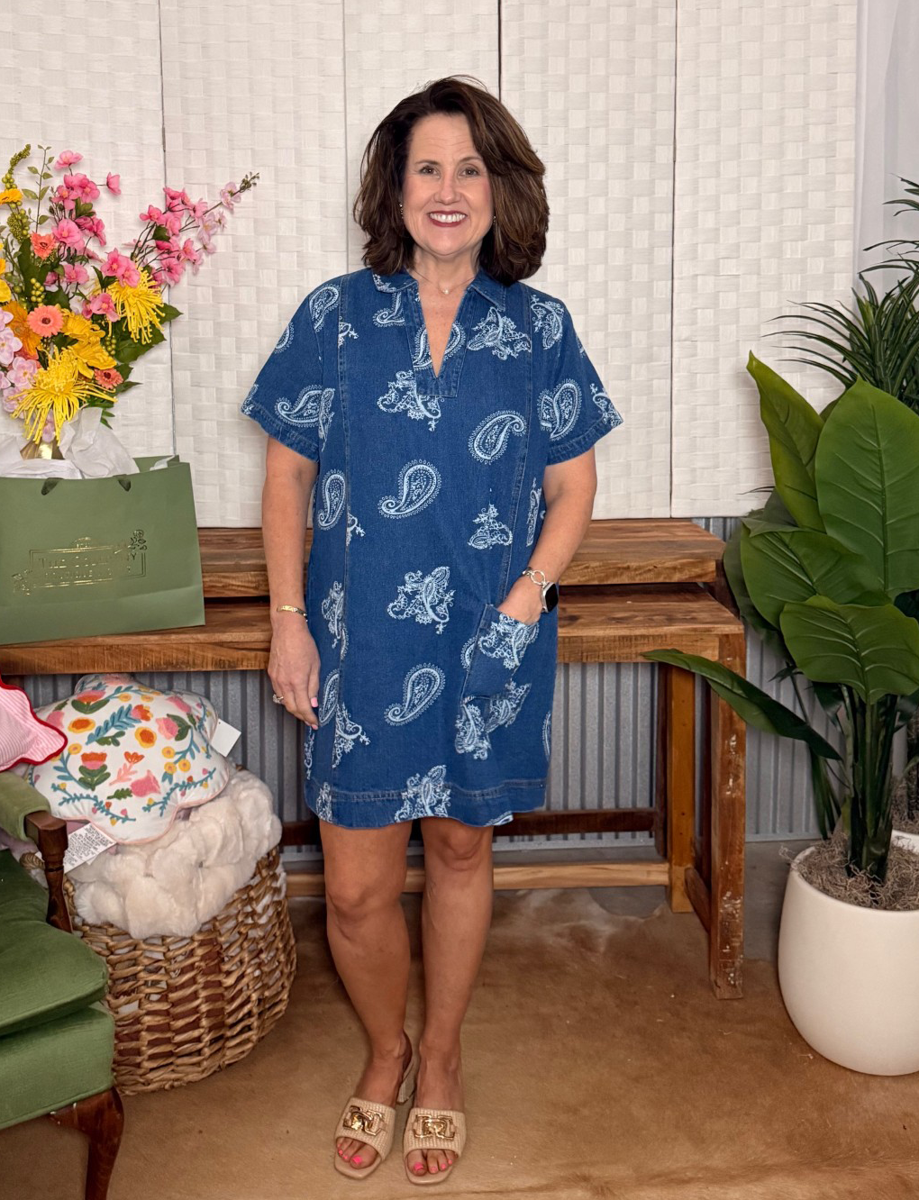 Effortless with a touch of vintage charm, this denim dress brings easy style to everyday wear. The soft washed denim feel pairs beautifully with a classic paisley print, while the relaxed silhouette keeps it comfortable and flattering. Finished with a subtle collar and V-neckline, it’s the kind of throw-on-and-go piece you’ll reach for again and again.