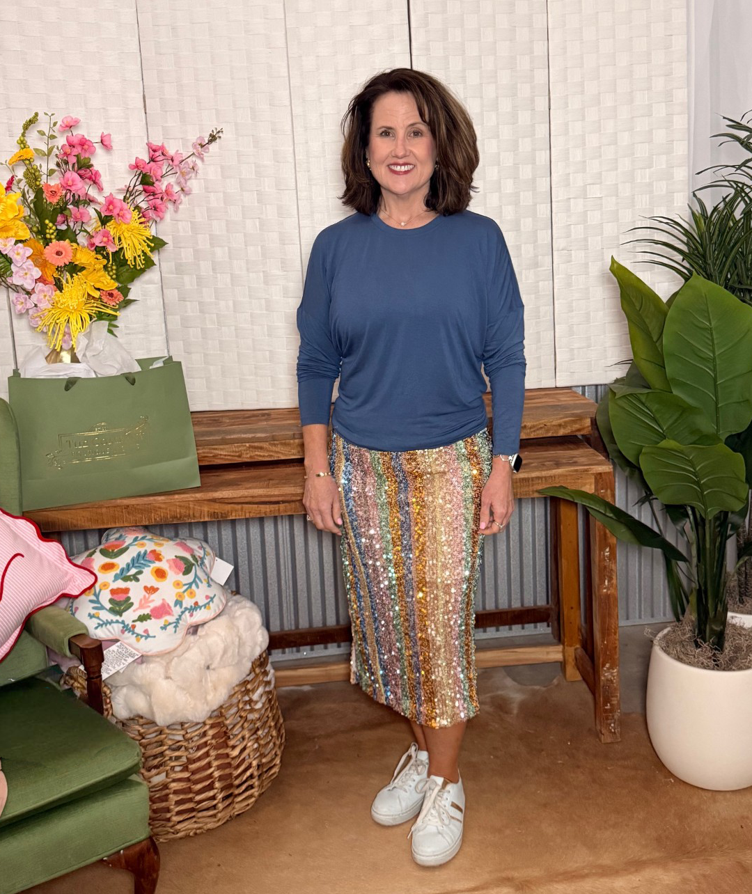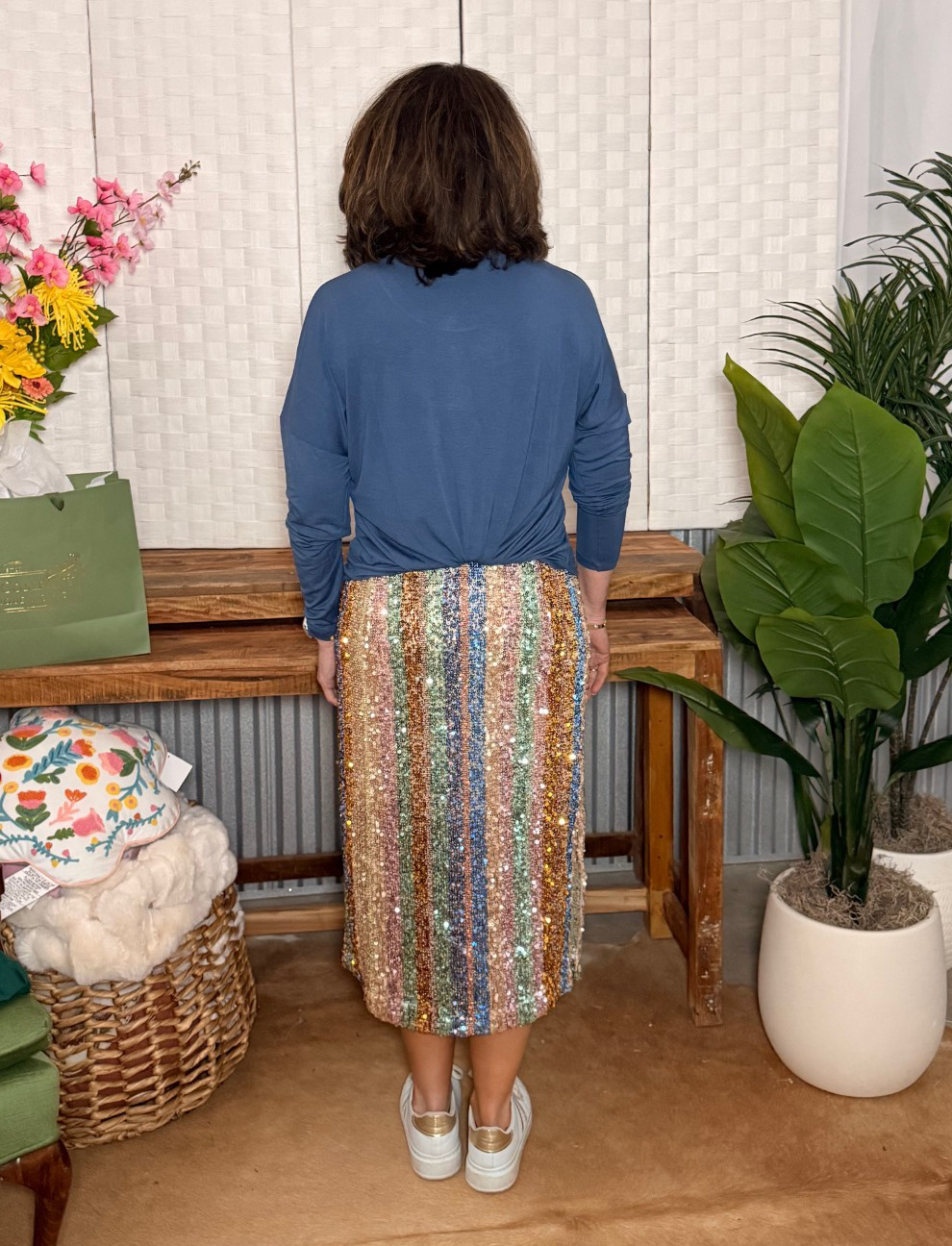 Make an entrance with this show-stopping multicolor sequin midi skirt! Covered in shimmering vertical stripes, this piece sparkles from every angle. It’s chic, fun, and guaranteed to turn heads—perfect for holiday parties, date nights, concerts, or anytime you want to shine a little brighter.