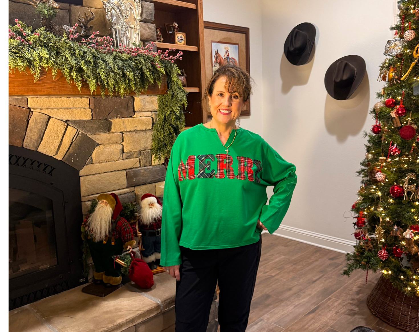 This AnnieWear Christmas Lettering Patch Mineral Washed Top features cozy 100% cotton fabric in a vibrant Christmas green. The playful design uses two complementary plaid patterns in the "MERRY" lettering across the front, adding a festive touch. With a comfortable v-neck and intentionally rough edges, this fun sweatshirt is perfect for quickly throwing on while decorating the tree or running errands during the holidays. Embrace festive style with ease and comfort in this cheerful Christmas essential.